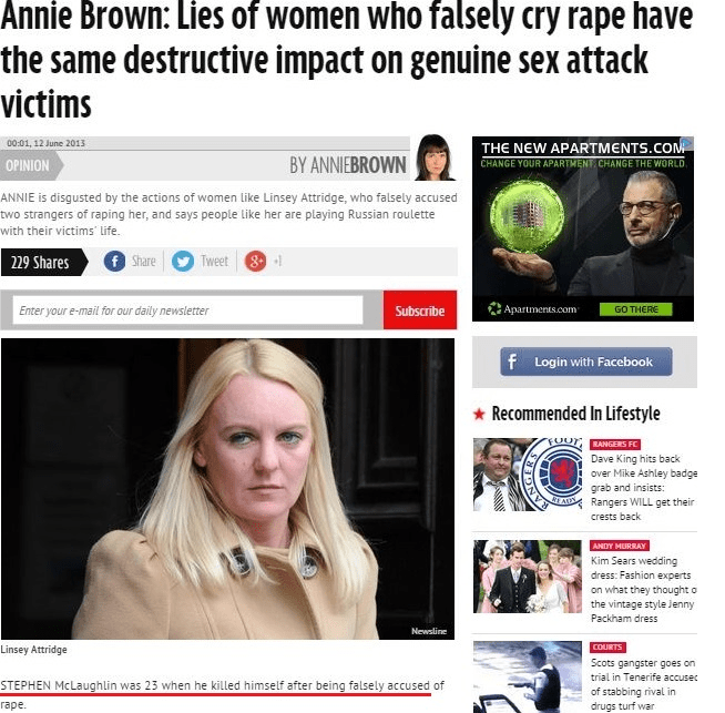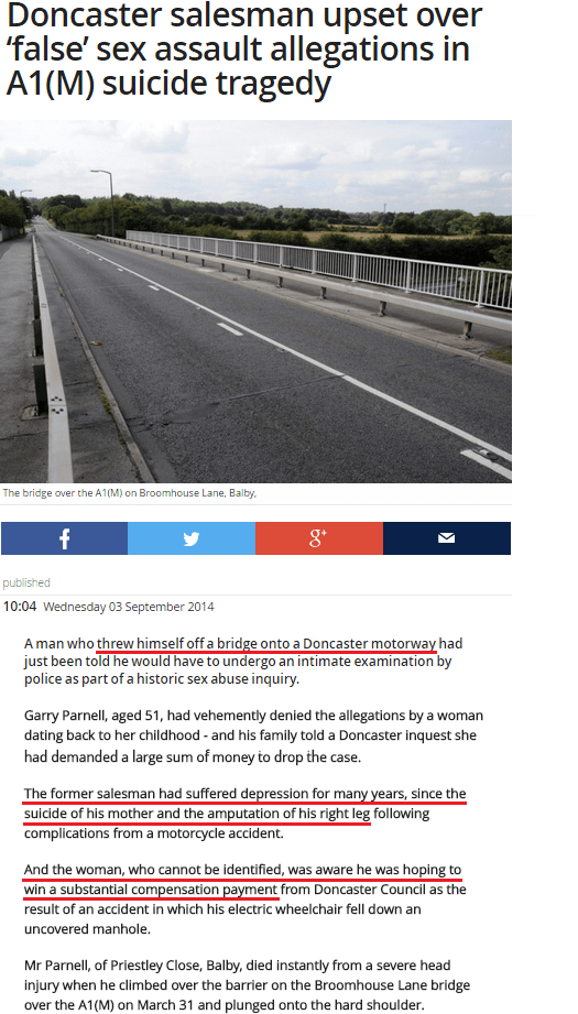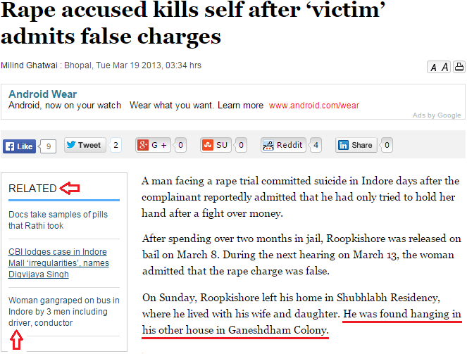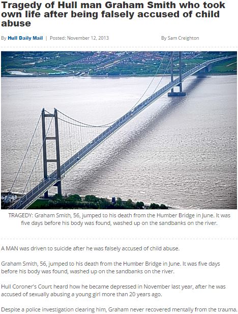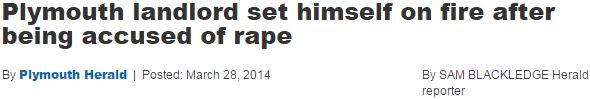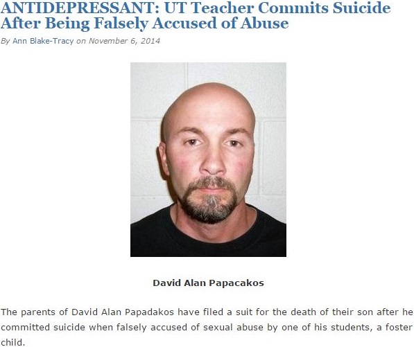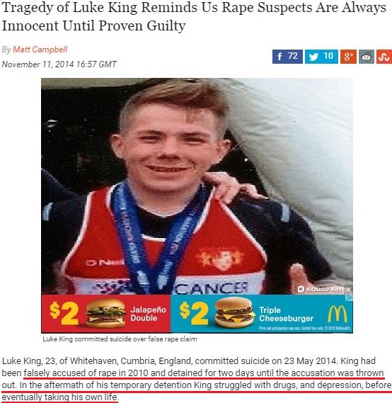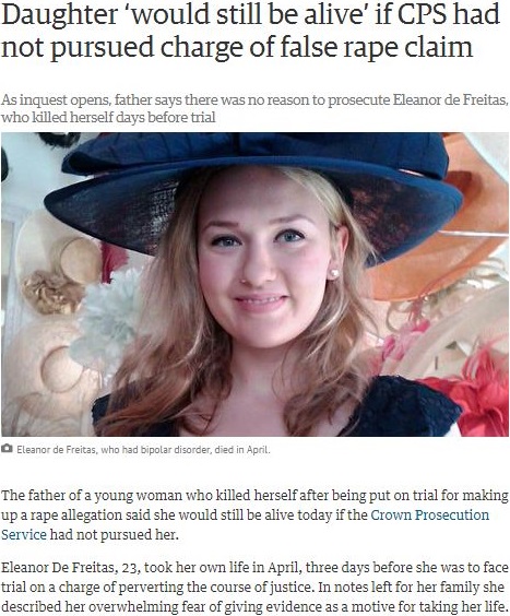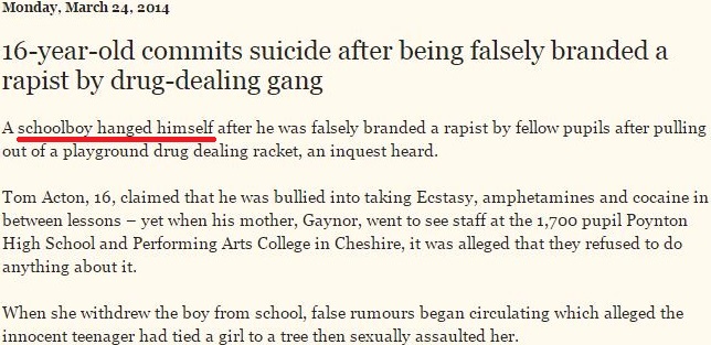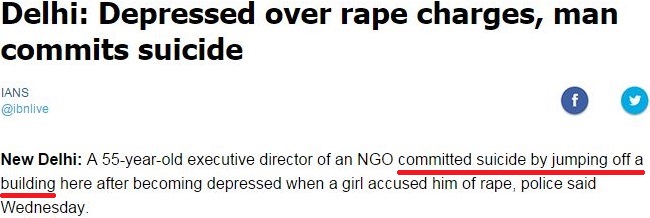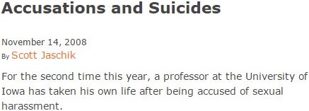 Editorial intrusions end here; the remainder of this post is a series of Internet clippings (linked to the “complete stories”) from which readers may draw their own conclusions about the motives and effects of accusation, bullying, and legal abuse. The author of this post would only point out before absenting himself that an accusation that may induce someone to kill him- or herself need not be of rape and that one of the suicides chronicled below is of a woman who faced being tried for falsely alleging she was sexually assaulted (“In notes left for her family, she described her overwhelming fear of giving evidence…”).