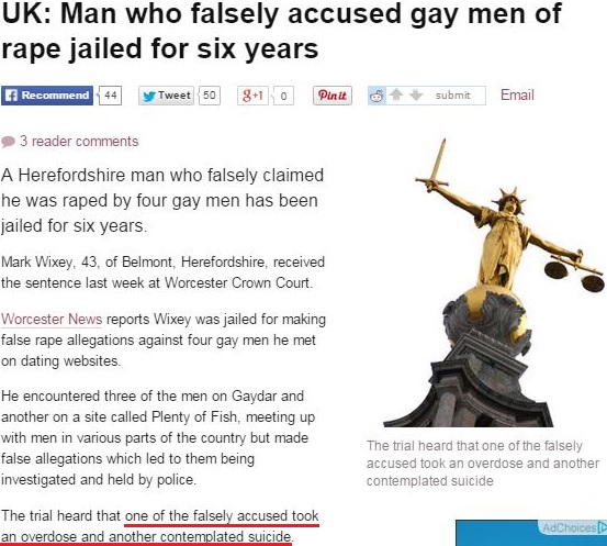 One of the stories highlighted below concerns a young man who was falsely labeled a rapist by some bullies at school. He hanged himself. He was 16. Another concerns a man who spent a year and a half in prison based on a false accusation of sexual assault (among other false accusations). While the man was behind bars, his mother killed herself, believing her son was a pimp and a rapist.