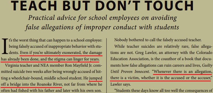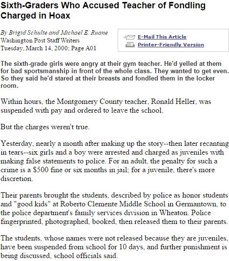 The article’s from 15 years ago. Fifteen. Significantly, though, no half-hearted sleuth would find it a challenge today to turn up commentaries on the Internet, mostly from feminist writers like the one who introduces this post, that either (1) deny such a thing ever happens or (2) deny it’s a big deal when it does happen—and deny it’s a sign that a culture of false accusation exists and has for some time. (A story so uncannily similar as to be almost identical can be found here. It appeared in The Huffington Post less than 24 months ago.)