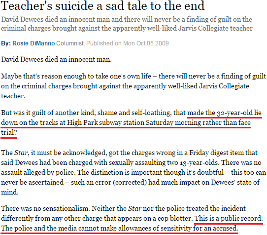 Keep this quotation in mind, too: “‘When they made the charge, that’s about 80 percent of the damage to your reputation right there,’ [attorney Paul F.] Kemp said. ‘Because even if you’re found innocent, people will assume you got off on a technicality. Or that there’s something there when there’s not.’”
