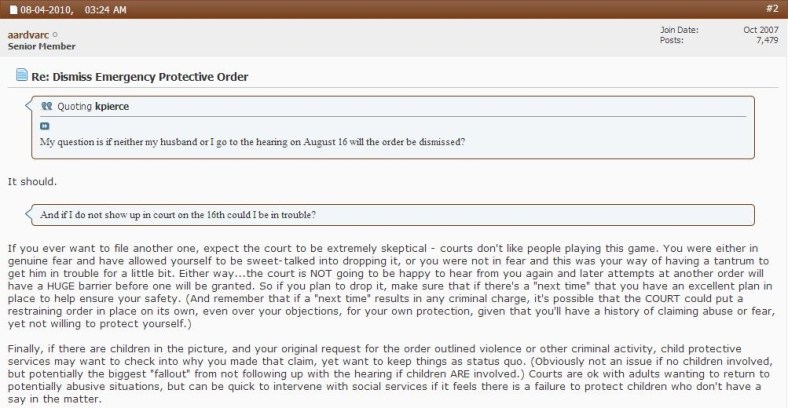 Notable, contrariwise, however, is that the respondent discourages the petitioner of the restraining order, who’s admitted to proceeding impulsively, from following through with her expressed intention to rectify an act that may have been motivated by spite. The respondent is the executive director of AARDVARC (An Abuse, Rape, and Domestic Violence Aid and Resource Collection), and behaviors like those the questioner owns up to undermine her endeavor’s credibility.