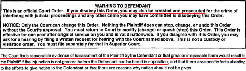 Appreciate that the court’s basis for issuing the document capped with the “Warning” pictured above is nothing more than some allegations from the order’s plaintiff, allegations scrawled on a form and typically made orally to a judge in four or five minutes.