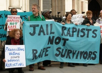 Picketers object to the prosecution of 109 British women in recent years for perverting the course of justice by falsely alleging rape. According to the protesters’ signs, all female accusers are “victims” and “rape survivors,” and the men they accuse are all “rapists” (ipso facto).