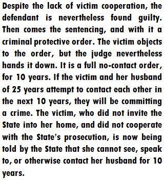 “I don’t know of any other provision in law in which people go to court and take out a civil action with the goal of handing over some of their power to a judge. When you get a restraining order, you relinquish your power to unilaterally consent to being contacted by the restrained party. As the ‘Notice to Restrained Person’ that the court gave me says, ‘If you violate this Order thinking that the Protected Person or anyone else has given you permission, you are wrong, and can be arrested and prosecuted. The terms of this Order cannot be changed by agreement of the parties. Only the court can change the order.’ The ‘Notice to Protected Person’ says ‘You cannot give the Restrained Person permission to change or ignore this Order in any way. Only the Court can change this Order.’”