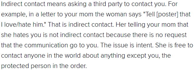 “Indirect contact” is often prohibited on civil injunctions, and this prohibition is typically expressed this way: “no third-party contact.” This doesn’t mean the “restrained party” on a restraining order is prohibited from talking about the plaintiff with anyone (or the world at large); it means she can’t communicate with the plaintiff, either directly (e.g., by phone, email, text, or in person) or through another.