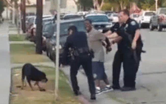 The companion animal of the restrained man in this still (who’s pleading, “Don’t shoot my dog!”) was moments later killed after being induced to lunge. The officer on the left, who leans in and provokes the dog, escalates a volatile situation and creates an excuse to fire. The dogs in the preceding images were also casualties of the police.