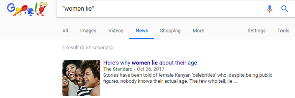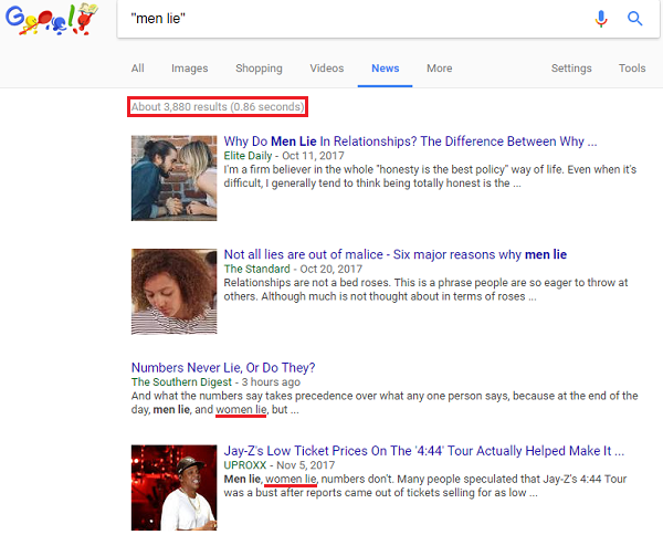 Women, per Google News on Nov. 7, 2017, right about the time the #MeToo movement was in full swing, only lie about their age. Also noteworthy is that the phrase “women lie” appeared in two of the top four results for “men lie” on this particular date, but neither of those was returned for the search “women lie.”