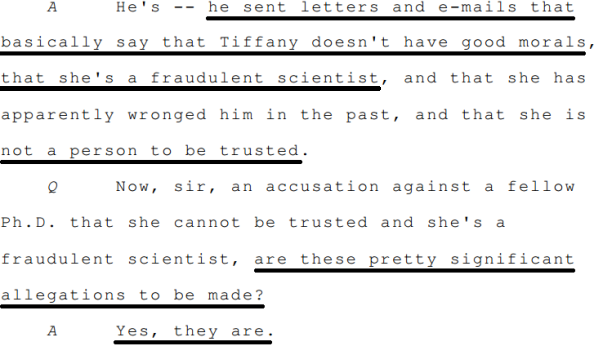 By testifying that I had called his colleague a “fraudulent scientist” because I told him she was a liar.