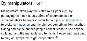 “Victim playing (also known as playing the victim or self-victimization) is the fabrication of victimhood for a variety of reasons such as to justify abuse of others, to manipulate others, a coping strategy, or attention seeking.”