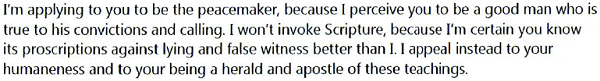 *For those who might wonder what I could have said in my appeals that would have urged seasoned clergymen to dismiss them as the ramblings of a stalker, here are a couple of examples.