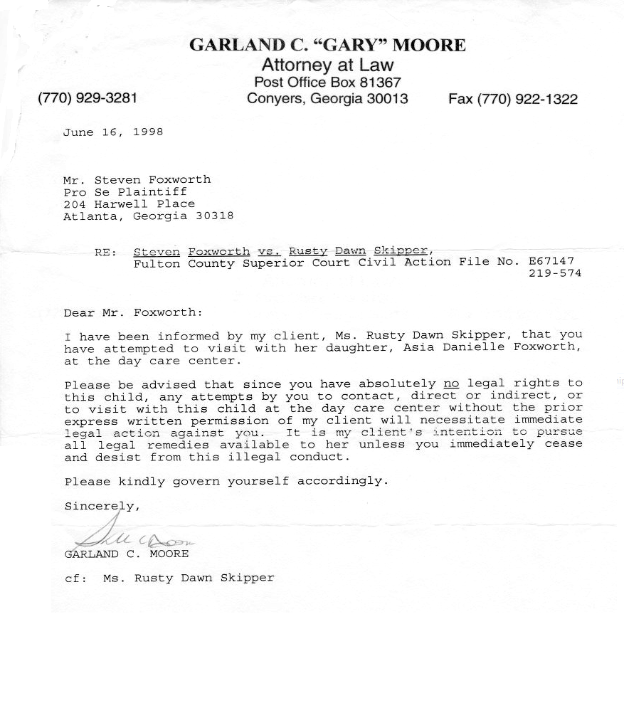 Upon my release, I showed the judge the two failed commitment attempts, the six not-guilty verdicts for allegedly violating the restraining order, the dismissal of the letter charges, the phone number of the FBI agent who told me the FBI had never been involved and had never investigated the letter—which supposed investigation the other side had used to hold me in jail—and the handwriting analysis proving the lawyer, Zach Brintle, wrote the letter. But the judge still extended the restraining order for yet another year.