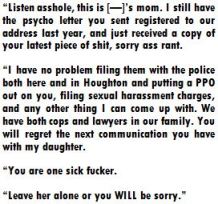 In April 2013, she filed another PPO against me even though I had not seen her in over four years. I had made no attempt to try and meet up with her. It was also issued ex parte, probably because of the first one. She began texting me less than three days after it had taken effect and didn’t show up to the appeals hearing that I scheduled. I missed parts of three days of work to fight an order that she didn’t even feel like defending. In two weeks, the same court, Wayne County this time, ruled against me then for me.